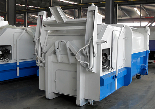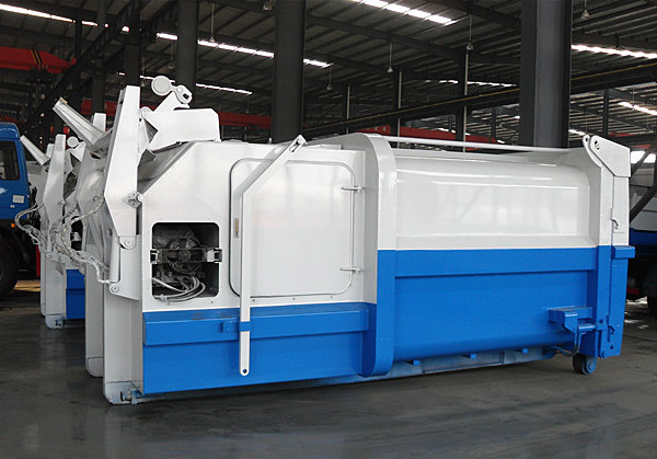 車廂可卸式垃圾車所匹配的垃圾箱為移動式水平壓縮垃圾箱,底部裝有四個腳輪及鎖緊裝置,前部設有吊環(huán),可被吊裝或卸離車體。