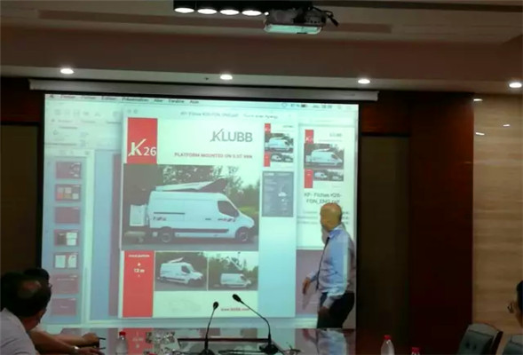 Henn總裁傾情演示PPT,講解產品卓越性能,據悉,KLUBB公司是歐洲頂尖的9~13米新能源高空作業車生產企業,主要產品是轎車、皮卡、輕卡三大品類別的高空作業車,在歐洲和中東、北美等發達國家擁有較高的市場份額和知名度。這些產品目前在國內處于空白,其市場潛力十分巨大。
