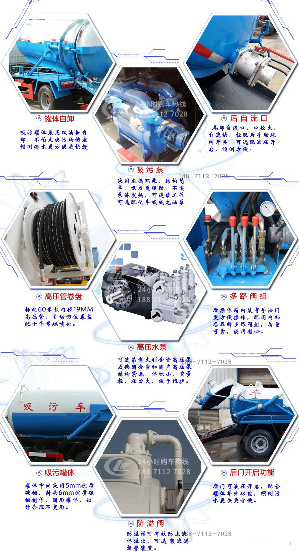 清水罐罐體有效容積:2.8立方米,運輸介質: 水,密度:1000千克/立方米,罐體尺寸(mm):長2050,直徑1450。 吸污罐罐體有效容積:3.2立方米,運輸介質: 液態污物,密度:900千克/立方米,罐體尺寸(mm):直段長2130,直徑1450。 水罐和吸污罐為兩個獨立罐體,清洗功能時用水罐, 吸污功能時用吸污罐,清洗吸污兩種功能不同時使用。